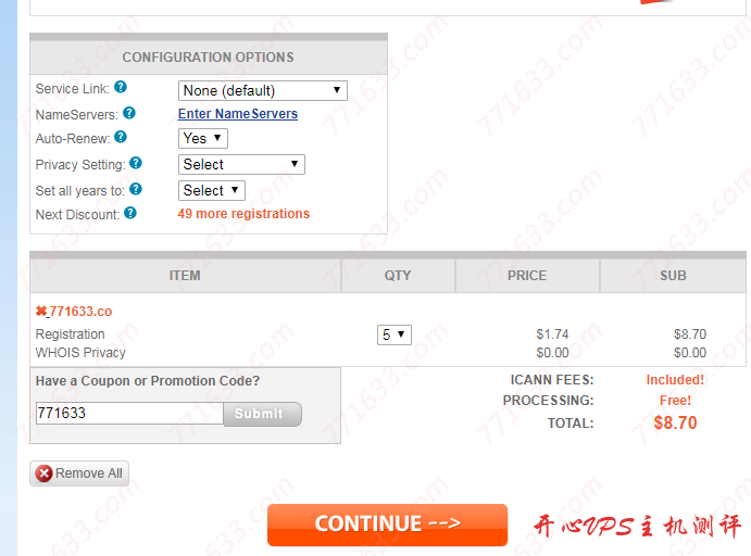 选择 CO 域名点击下方的蓝色按钮,进入选择域名界面,直接选择 5 年,输入优惠码 771633 就可以,如果你不是新用户,那么你再注册一个就可以,换个支付方式就成新用户了。