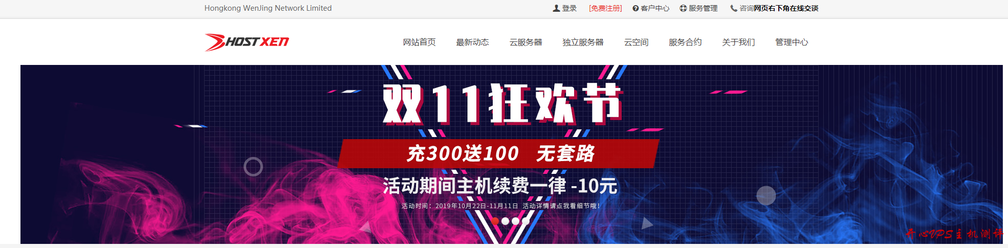 HostXen是香港稳景网络旗下站点,提供基于XEN架构的 VPS 主机,数据中心包括香港 CE、沙田机房、香港大埔,分别是香港 1 区,香港 2 区,香港 3 区;洛杉矶 C3、洛杉矶 MC,分别美国一区,美国二区,及日本东京、大阪,分别为日本一区,日本二区;还有新加坡区多个数据中心。商家提供可以 DIY 配置的云主机平台,基础套餐 2G 内存起步,目前主机商开始双十一预热活动,会员充值 300 元赠送 100 元,续费也可以使用立减优惠码,新客户注册送 20 元代金券。
