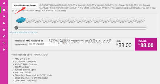 以上两款主机目前已在产品列表上架,直接选择 Virtual Dedicated Server 即可(如图),香港高防 VDS 也可以付费升级中国方向防御至 10G,该系列除了两款香港高防产品外,还包括了月付 29 美元起的香港常规 VDS 以及新加坡 VDS 产品。