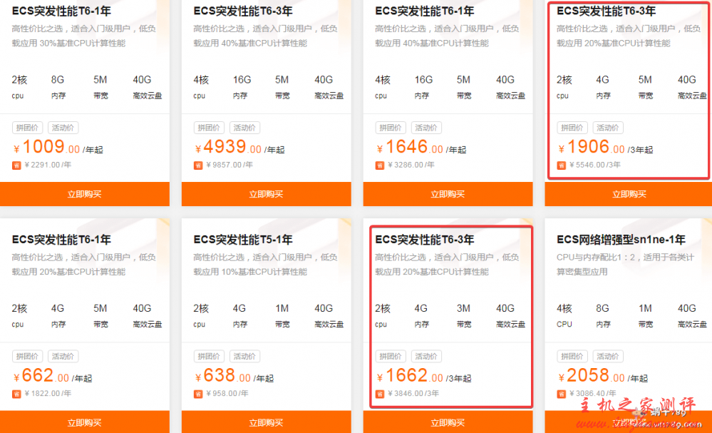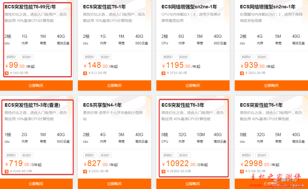 阿里云双 11 返场拼团活动主打的是 ECS 突发性能 T6、ECS 突发性能 T5 云服务器产品,亮点是 2 核 1G 内存低于 99 元起,有香港免备案云服务器方案可以选择。虽然是突发性能云服务器,在 CPU 性能方面有所限制,但是运行网站项目是没有什么多大压力的。红框的方案大家可以重点关注下。