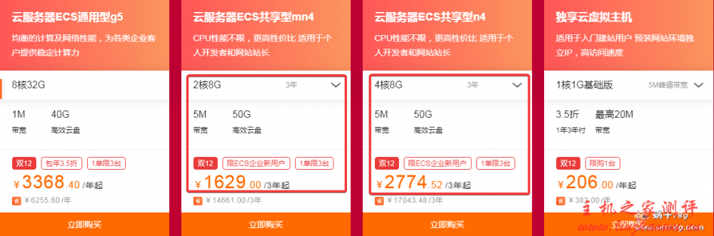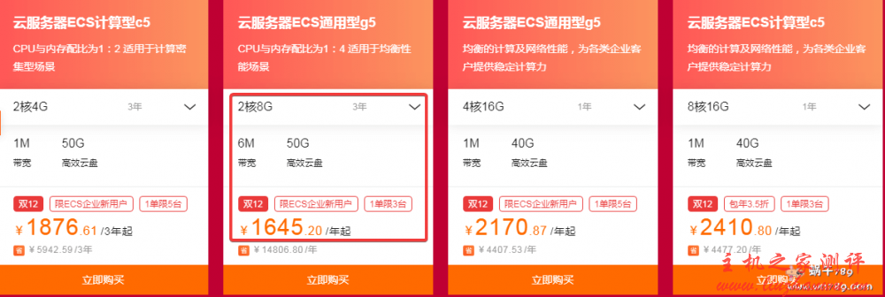 上面两个活动都参与了,接下来就看看新用户的云服务器促销方案了。主机之家测评文章开头说了,此次阿里云服务器双 12 促销活动对企业认证的新用户力度是非常大的。5Mbps 带宽以上促销云服务器方案基本都是企业认证用户参与。最低都是 2 核 8G 内存起步,5M 带宽 1629 元/3 年起。另外还有 4 核 8G、8 核 16、16 核 32 的高配云服务器可以选择。有需要的就尽情撸吧,并且可以一次性以折扣价格购入多台。