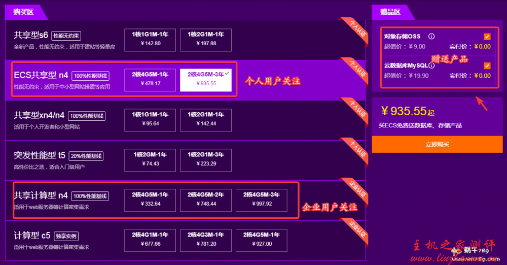 第一个活动是个人、企业认证新用户买云服务器送对阿里云象存储 OSS、阿里云云数据库 MySQL!其中个人用户和企业用户推荐关注的方案下图已经标注红框。