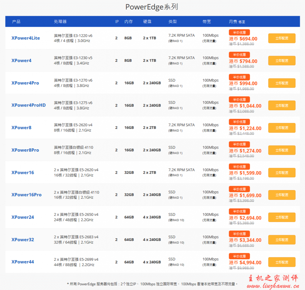 下面图片列举的是所有 PowerEdge 服务器方案,每个方案均包括:2 个独立 IP、100Mbps 独立国际带宽、100Mbps 本地 (HKIX) 带宽、不限流量、加 100 港币可以选择直连内地的 5Mbps 中国国际独享带宽。其中标注 SSD 硬盘的方案默认选择的是 SSD 硬盘,大家也可以选择存储更大的 HDD 硬盘。