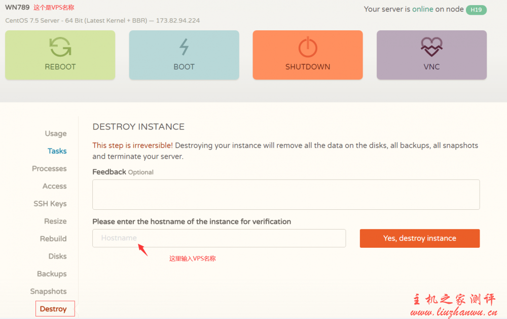 第二个是删除 VPS 重开,因为大几率是开到国内无法访问的 IP,已开始就花 2 美元去换 IP 估计一般都不会太愿意,那么我们就删除重开。不需要了也是在这里删除。